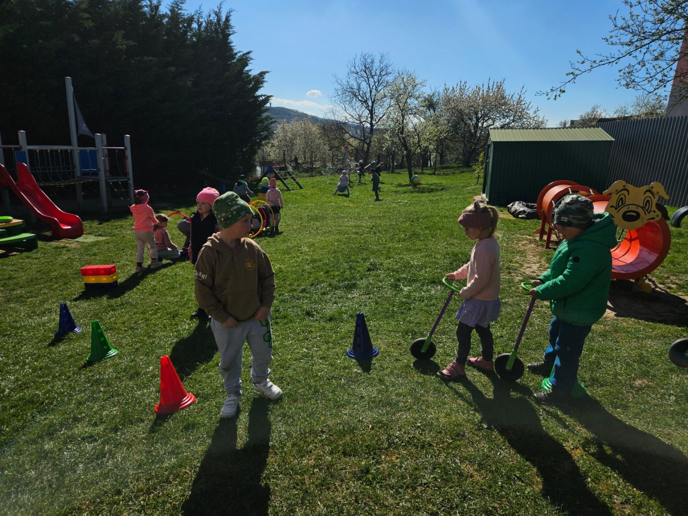 Nechýbali ani pohybové aktivity, v ktorých si deti zacvičili, zvládli prekážkovú dráhu, zahrali sa pohybové hry, ktoré sú prirodzenou súčasťou ich zdravého vývoja. Uvedomili si, že pohyb je dôležitý nielen pre posilnenie zdravia, ale prináša nám aj radosť a dobrú náladu. Pohyb a pracovné nasadenie deti využili aj pri skrášľovaní areálu materskej školy - čistili trávu, sadili kvietky do záhonov, zbierali odpadky.